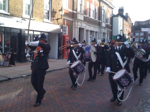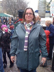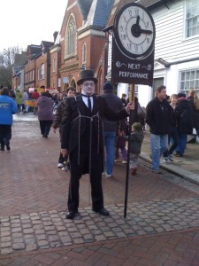Eventually it got dark, the rain started but we continued drinking the mulled wine and got a spot ready for the main procession through the highstreet, of all the people in Dickensian dress and the fake snow