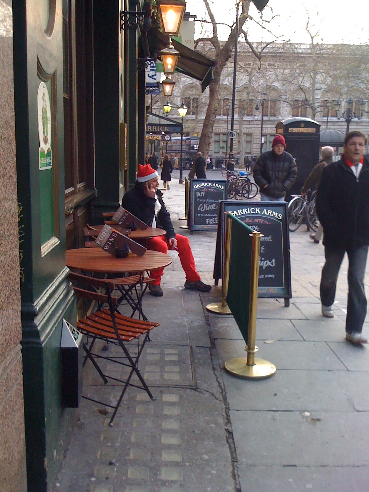 So, enough of the whinging about the cold. I travel into central London via the no. 73 and the no. 38 bus, hopping off at Cambridge Circus to wander on down to Trafalgar Square where I spy a Santa taking fag and phone breakoutside the pub just down from Leicester Square