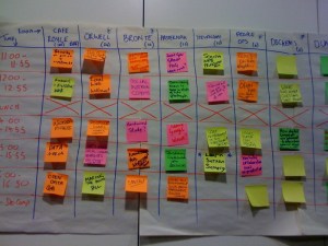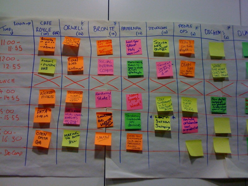 There was no agenda. The sessions at UKGC10 were suggested on the day itself by those attending, literally just standing up and speaking out to the group about what they wanted to talk about. Ideas for sessions were written on colourful post-its, and then arranged on a grid representing the timetable. This took aroud half an hour to complete, and the first sessions kicked off at 11am.