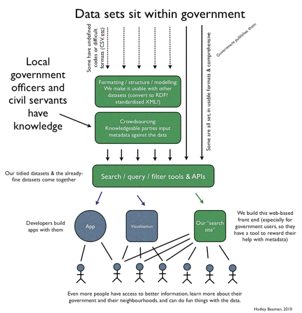 Quite simply it’s about how can Open Government Data be improved, and made more accessible to the “man on the street”. I don’t think that you should need to be a developer or large organisation to be able to access Government Data. By “access” I don’t mean just being able to link or download the data, but to be able to actually use it meaningfully without trying to learn new coding languages.