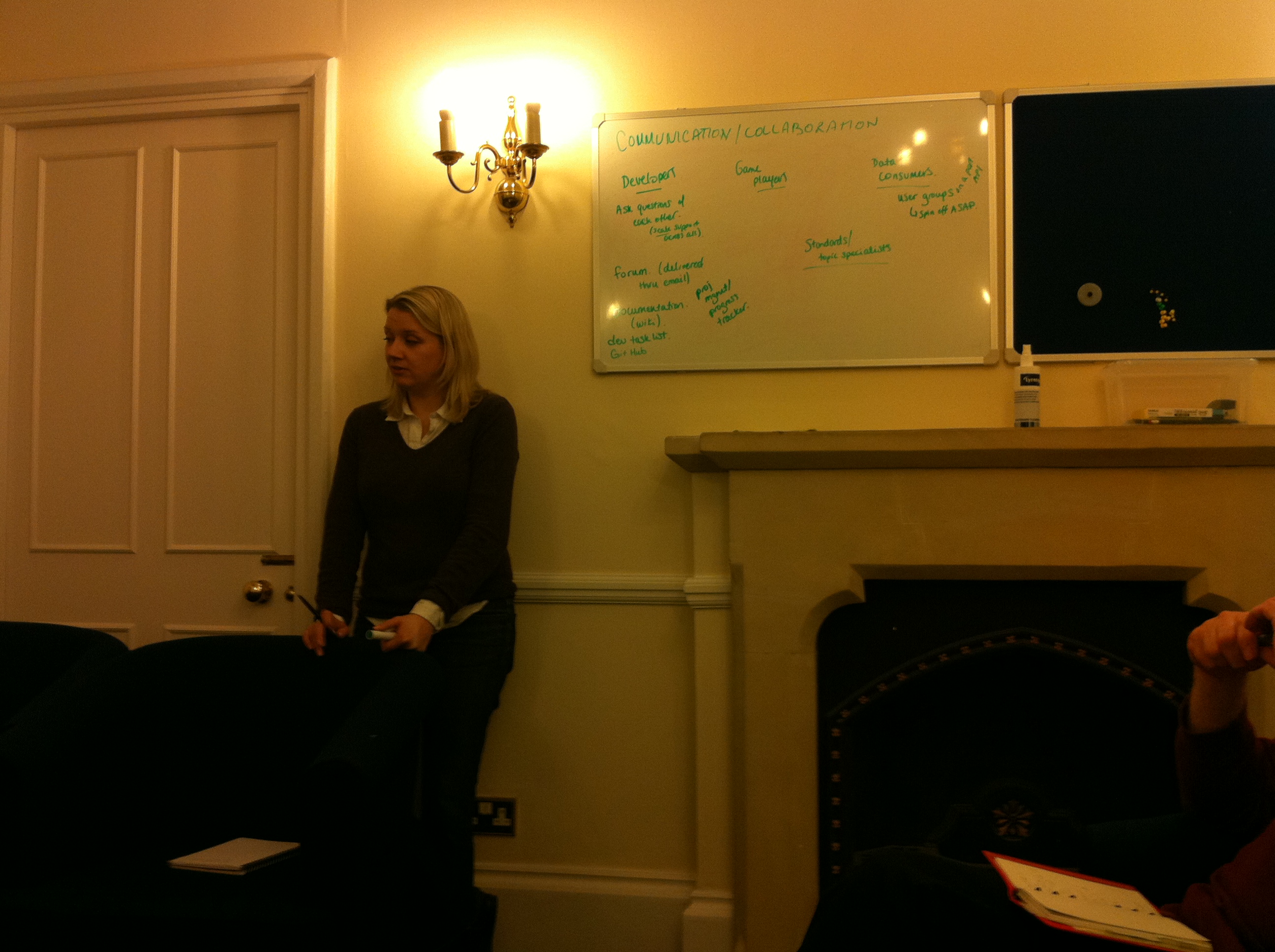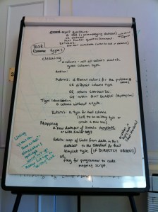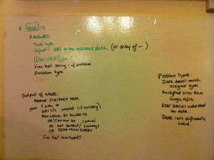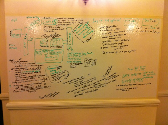 I wasn’t in this group either, (too busy getting all comms focused in Hadley’s group!), but you can see from the Whiteboards & Flipcharts that this group was focusing in breaking down what tasks needed to be done programatically, and how they could possibly start going about that.
